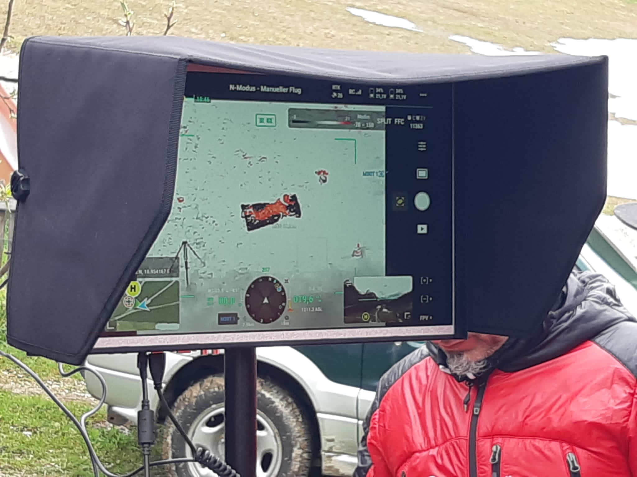 Im Anschluss daran ging es dann nach draußen um das Gerät in Aktion zu sehen. Sehr anschaulich wurden durch das Team der Drohnenstaffel sämtliche Funktionen vorgeführ,t was die Ortstellenmitglieder gebannt an die Monitore fesselte.