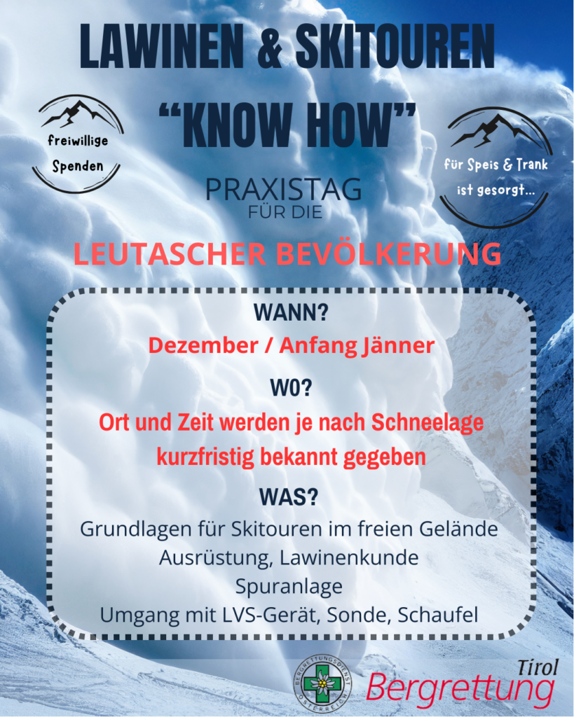 Abschließend möchten wir auf unseren geplanten Praxistag „Lawinen & Skitouren – Know How“ (Anmeldung unter leutasch@bergrettung.tirol) und wie jedes Jahr auf den Förderer der Bergrettung Tirol hinweisen. Unter www.bergrettung.tirol/bergungskostenversicherung oder direkt über die Ortsstelle Leutasch kann das Fördererpaket um 36,–/Jahr erworben werden.